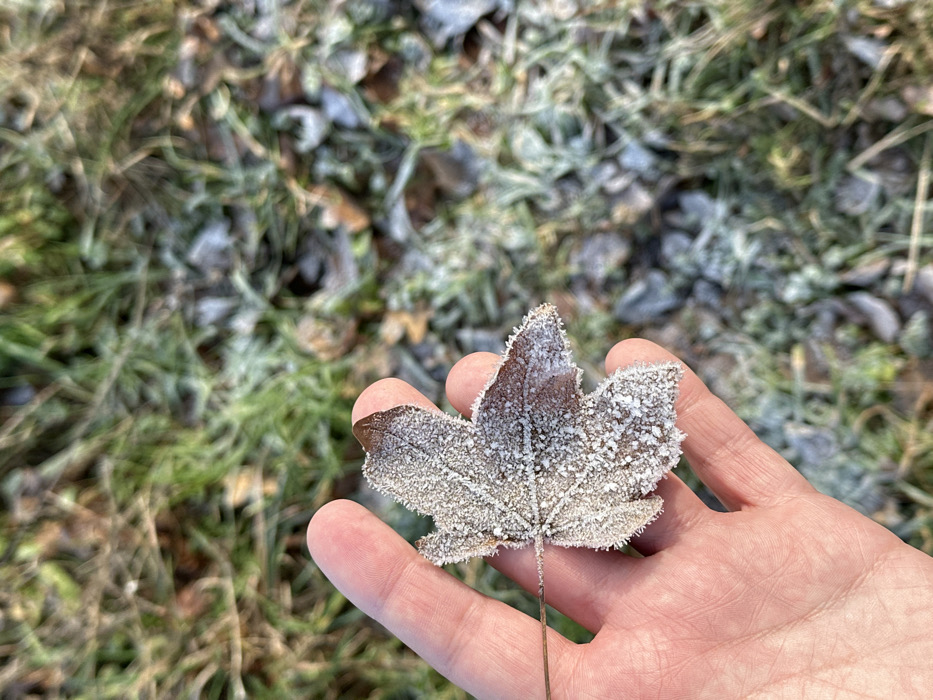 - "A light-skinned human hand holds a single, brown, lobed leaf, approximately 8-10 cm in length, covered in a dense layer of white crystalline frost" by FM-o3SHn1, licensed under CC BY 4.0