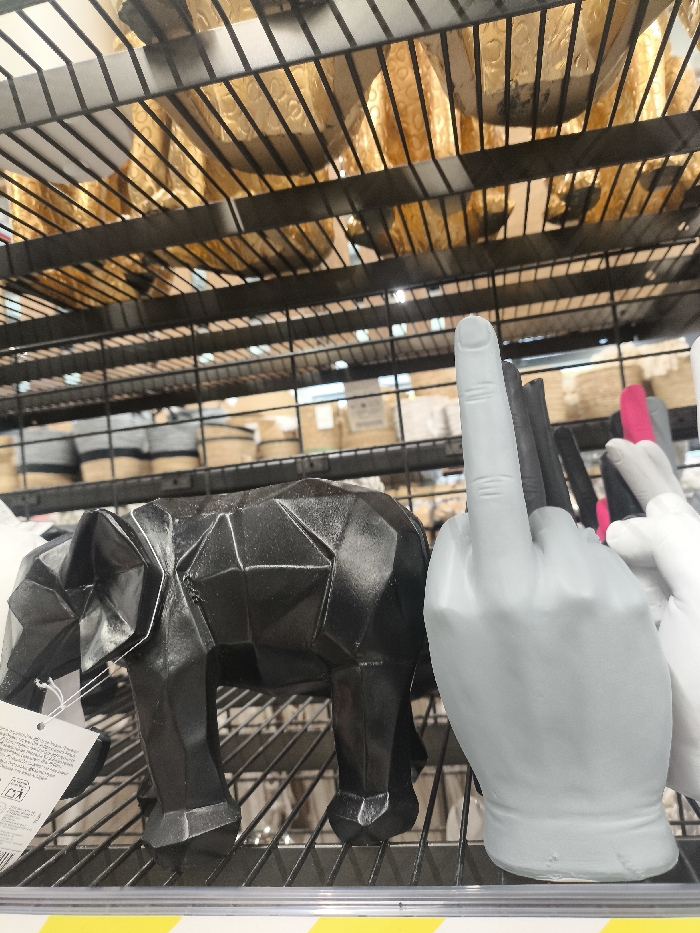 The scene depicts a retail or warehouse environment located in Dresden, Germany. In the foreground, a black, geometrically faceted elephant figurine stands on a black wire shelf. A white product tag hangs from its left side. To the right of the elephant, a light grey figurine shaped like a human hand is positioned with its middle finger extended upwards. Behind this grey hand, parts of similar hand figurines in black and pink are visible, along with another white hand figurine to the far right. Above and behind the main subjects, multiple tiers of black wire shelving are visible, densely packed with items wrapped in golden foil packaging. The background, blurred through the shelving, shows various beige-colored boxes and containers, some resembling woven baskets, consistent with an interior commercial setting. Below the main shelf, a yellow and white striped tape marks the edge of another shelf. No individuals are visible.