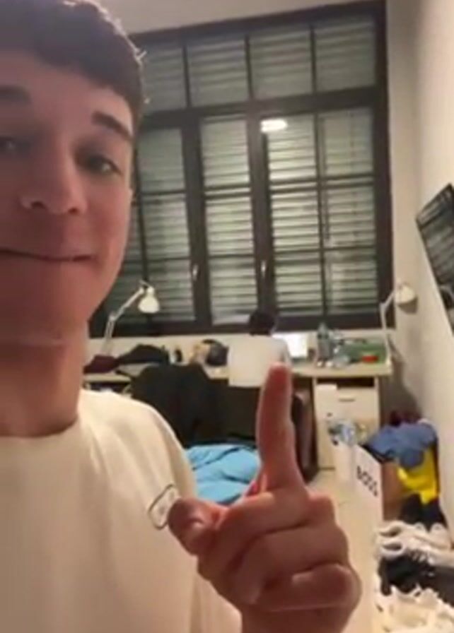A young man is recording a video of himself in what appears to be a small dorm room
