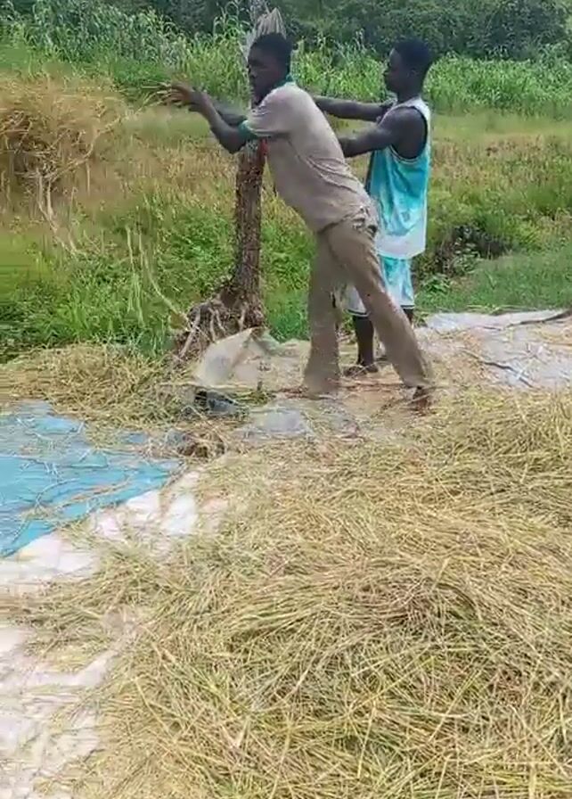 Two men are threshing rice in a rural setting. One man is holding and hitting rice against a wooden structure, while the other spreads the resulting straw and grain on a blue and white tarp laid on the ground. A pile of grain and straw covers the tarp. Trees and grass are visible in the background.