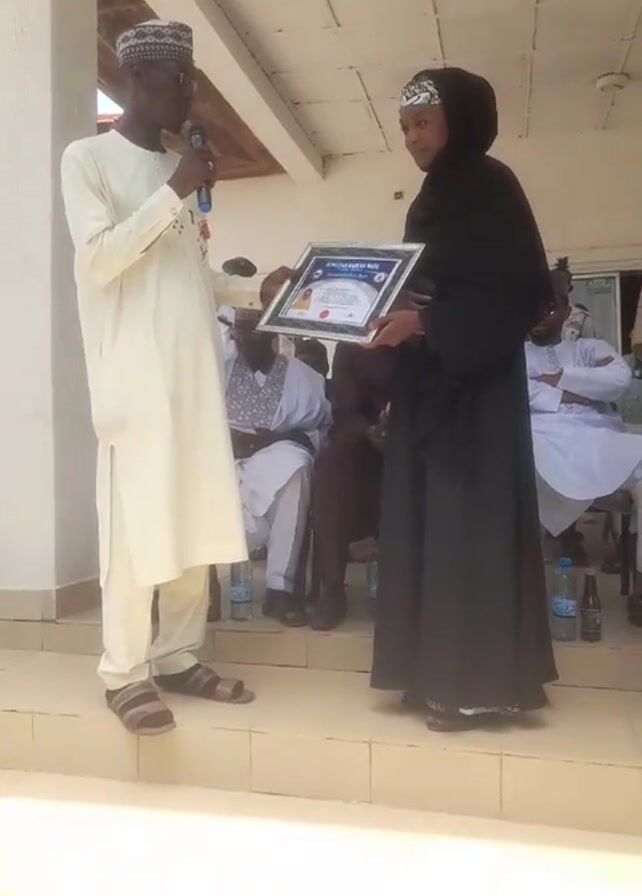 man in a light-colored, traditional robe and cap presenting a framed certificate to a woman wearing a black hijab and dress. They are standing on a small set of steps leading to a building. The man is holding a microphone and appears to be speaking. Behind them, several men are seated on chairs and benches, also in traditional attire. There are water bottles scattered around the base of the steps. The building has a white ceiling with a visible light fixture.