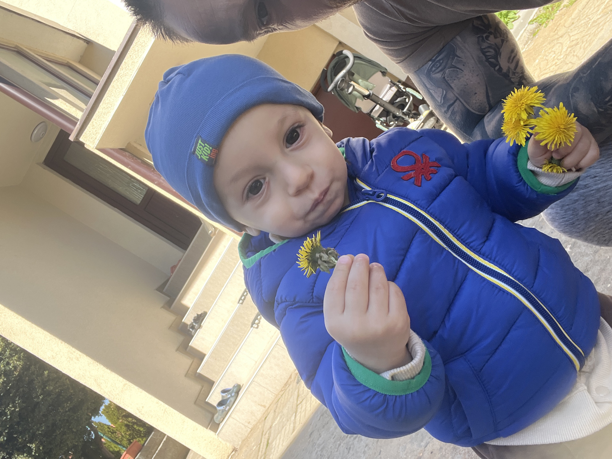 A young child in a blue beanie and blue jacket holds dandelions in both hands, looking up at the camera. Visible behind the child are parts of an adult's face and tattooed arm, suggesting they are holding the child. In the background is a light-colored building with steps, potentially located in Lozen, Bulgaria. A stroller is also partially visible in the background. The scene appears to be outdoors.