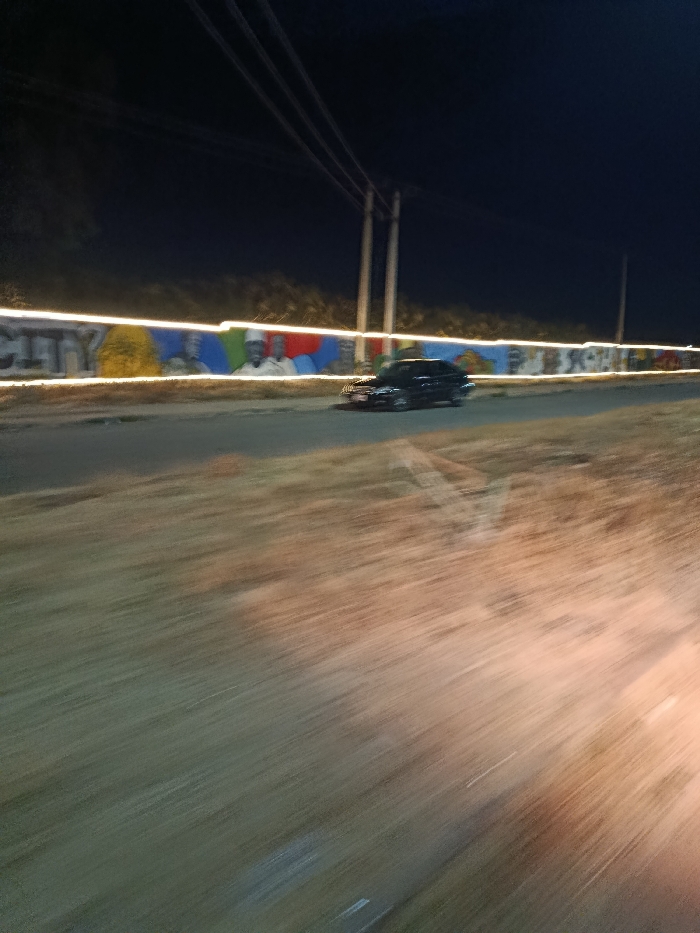 A blurry, low-light shot captures a dark car parked alongside a road near a mural-covered wall with "CITY" visible