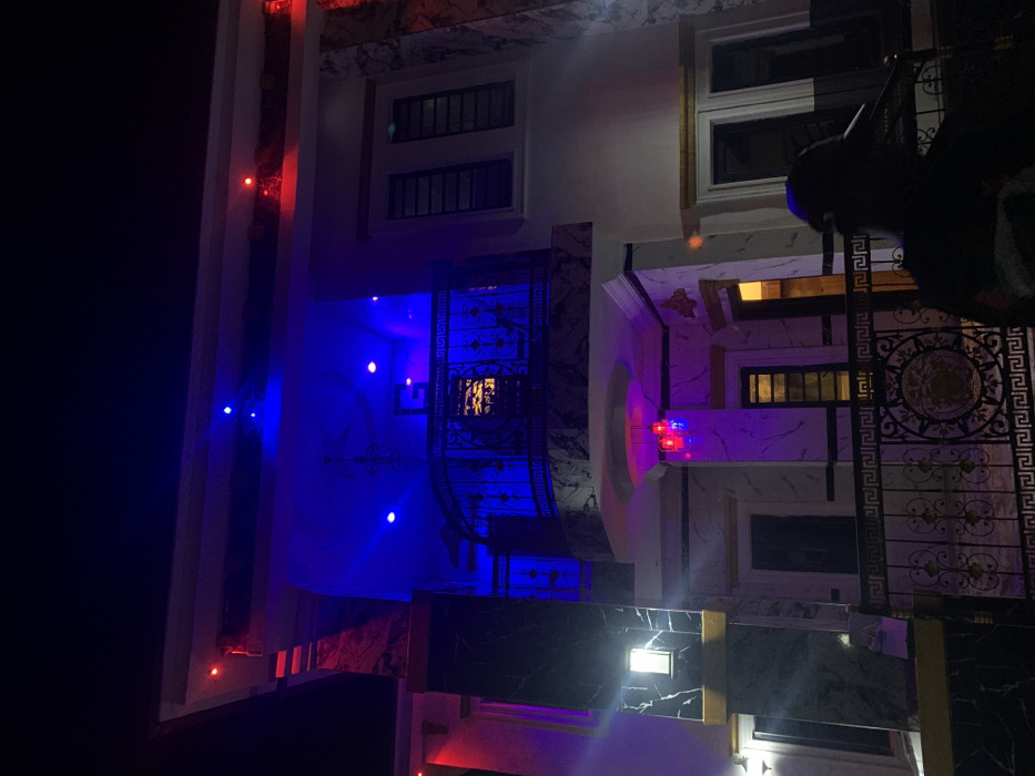 A building's exterior at night, vertically oriented, is illuminated with red and blue lights. Windows are visible on multiple floors. The building features marble accents and a wrought-iron gate with intricate designs. A balcony with metal railings extends from the upper level. The scene conveys a sense of nighttime elegance and architectural detail.