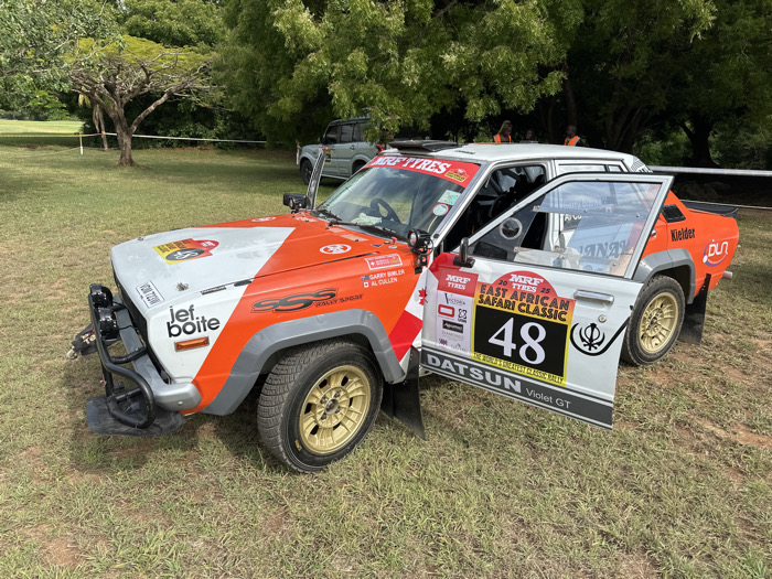 - "A two-tone white and orange Datsun Violet GT rally car, bearing race number 48, is positioned on a green grassy field in Gombato Bongwe ward, Kenya" by FM-tTf9t1, licensed under CC BY 4.0