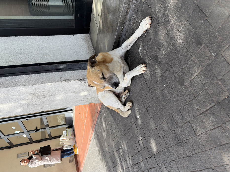 This image depicts a street scene during daylight in Câmara de Lobos, Portugal. In the immediate foreground, a medium-sized, short-haired dog with tan and white markings lies resting on a dark grey paver sidewalk. Its eyes are closed, and its front legs are extended forward on the pavement. Sunlight illuminates the dog and casts defined shadows on the textured pavers. In the mid-ground, to the left, a woman stands near the entrance of a building. She is dressed in a light-colored long coat, blue jeans, and bright yellow sneakers, holding a black handbag in her left hand. Several white plastic bags rest on a raised, terracotta-colored tiled section of the ground behind her. The building behind the woman features a glass-paneled entry door with a light, textured wall section to its right. Further to the right, a dark door frame reveals a silver, perforated cylindrical object within the doorway. There is no direct interaction between the dog and the woman.