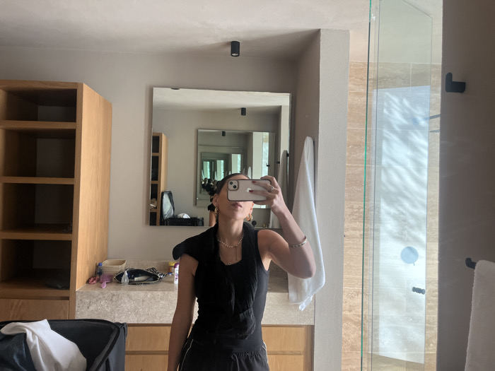 A woman stands in a bathroom, taking a mirror selfie. She's wearing a black top and has a dark-colored towel draped over her shoulders. The bathroom features a large wooden cabinet with open shelves, a vanity area with toiletries, a large rectangular mirror, and a glass-walled shower. Natural light streams into the room, possibly from a window within the shower. A white towel hangs on a dark-colored hook near the shower.