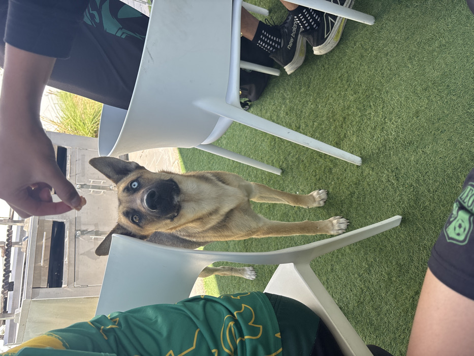 A light brown dog with heterochromatic eyes (one blue, one brown) gazes upwards between the legs of two white plastic chairs. Individuals sit at the chairs; one person extends a hand towards the dog, seemingly offering food. Another individual wears a black t-shirt with a green logo. The setting appears to be outdoors on a bright day with artificial green turf flooring visible beneath the chairs and dog.