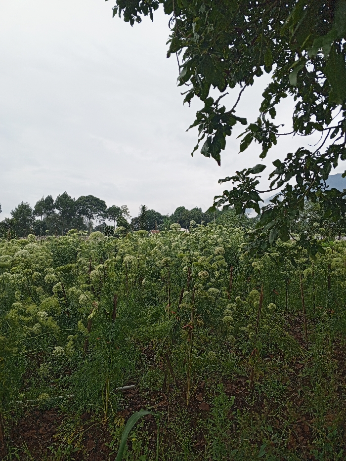 A field densely packed with green plants bearing clusters of small white flowers stretches to a distant treeline under an overcast sky. Pine trees are visible along the horizon. A tree branch with green leaves hangs down from the top right corner, partially obscuring the scene. The ground is dark and earthy, with hints of bare soil visible. The scene evokes a sense of rural tranquility.