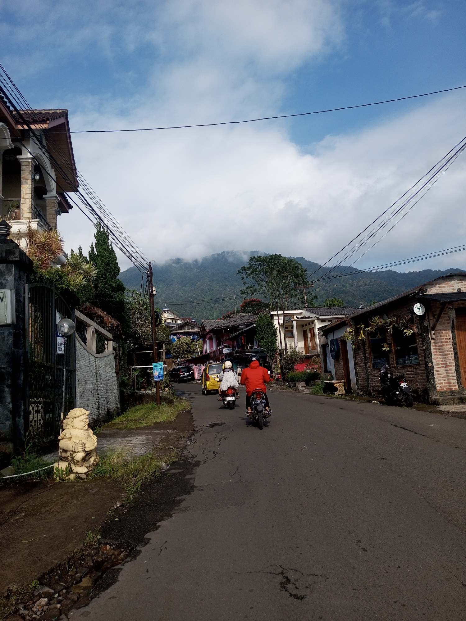 A street scene shows three people on motorbikes driving away from the viewer on an asphalt road. The person closest is wearing a red jacket. Houses line both sides of the street, with a forested mountain in the background partially obscured by clouds. Electrical wires stretch across the sky. A statue sits on the left side of the street near the entrance to a property. Two motorbikes are parked on the right. The sky is partly cloudy. The location is identified as Mya Sit Kaing Ywar Thit, Myanmar.