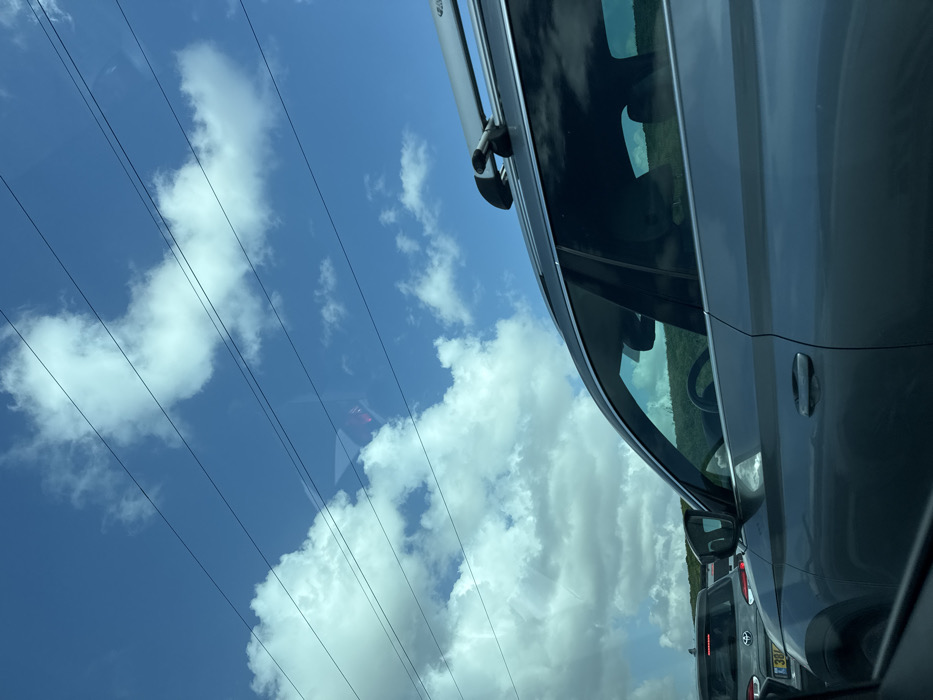 - "The image displays a daytime scene of vehicular traffic from an interior perspective, looking forward and to the right, under a bright blue sky adorned with scattered white cumulus clouds" by FM-VS3GA3, licensed under CC BY 4.0