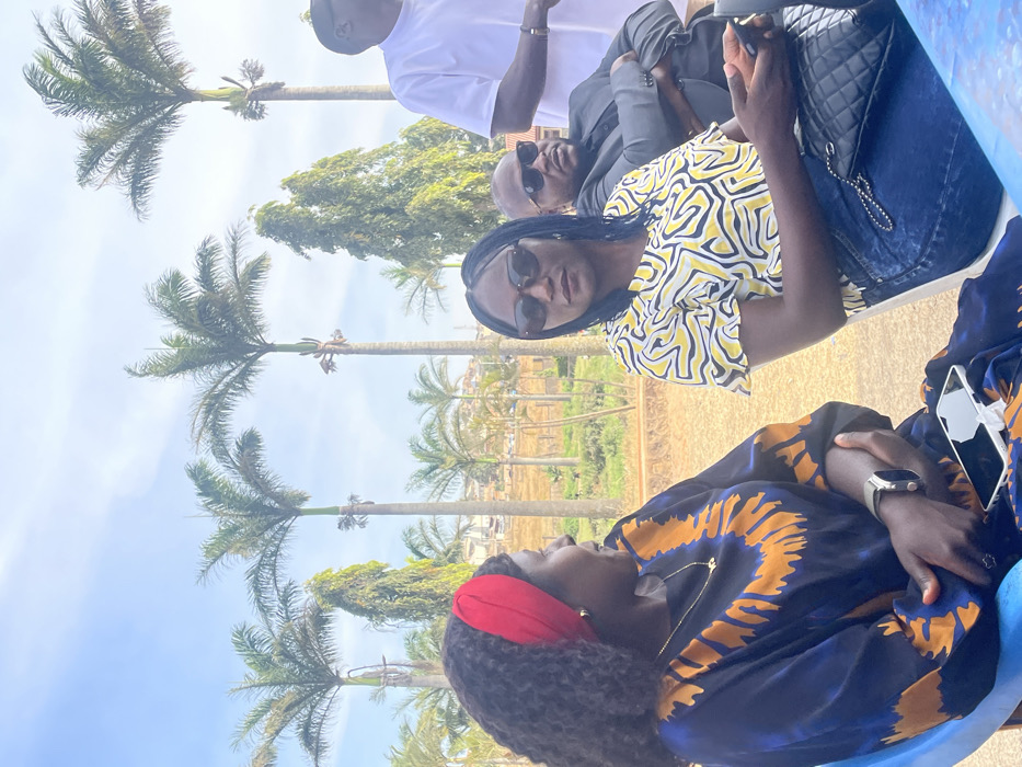 The image captures an outdoor scene in Jos, Nigeria, under a clear blue sky featuring multiple tall palm trees and distant hills with scattered residential structures. Four individuals are present. On the left, a woman with dark, curly hair and a red headband wears a navy and orange patterned kaftan, a gold necklace, and a light-colored watch. She is seated on a blue plastic chair, holding a white smartphone, and looks towards the right with a slight smile. Adjacent to her, a second woman with dark braided hair and sunglasses wears a yellow and white abstract-patterned top and blue jeans. She is seated on a light-colored chair, holding a black smartphone and a black quilted handbag, and maintains a neutral gaze forward. Behind her, a man with dark sunglasses, wearing a dark suit jacket over a white shirt, is seated with his arms crossed. On the far right, a partial view of a fourth individual, a man in a white garment and sunglasses, is visible. The ground in the mid-ground consists of exposed brown earth.