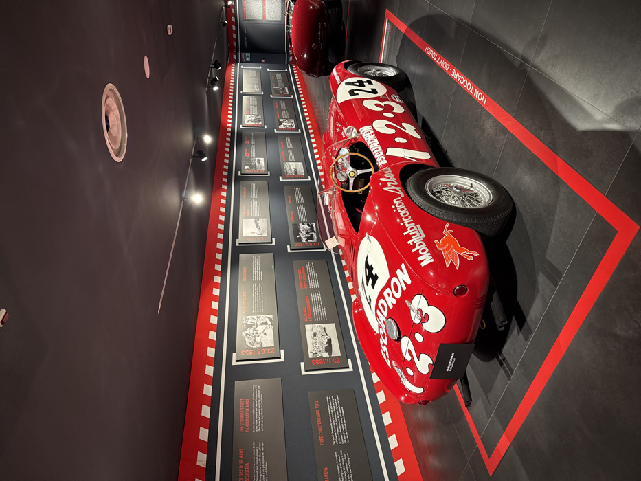 The image depicts an indoor exhibit at the Ferrari Museum in Maranello, Italy