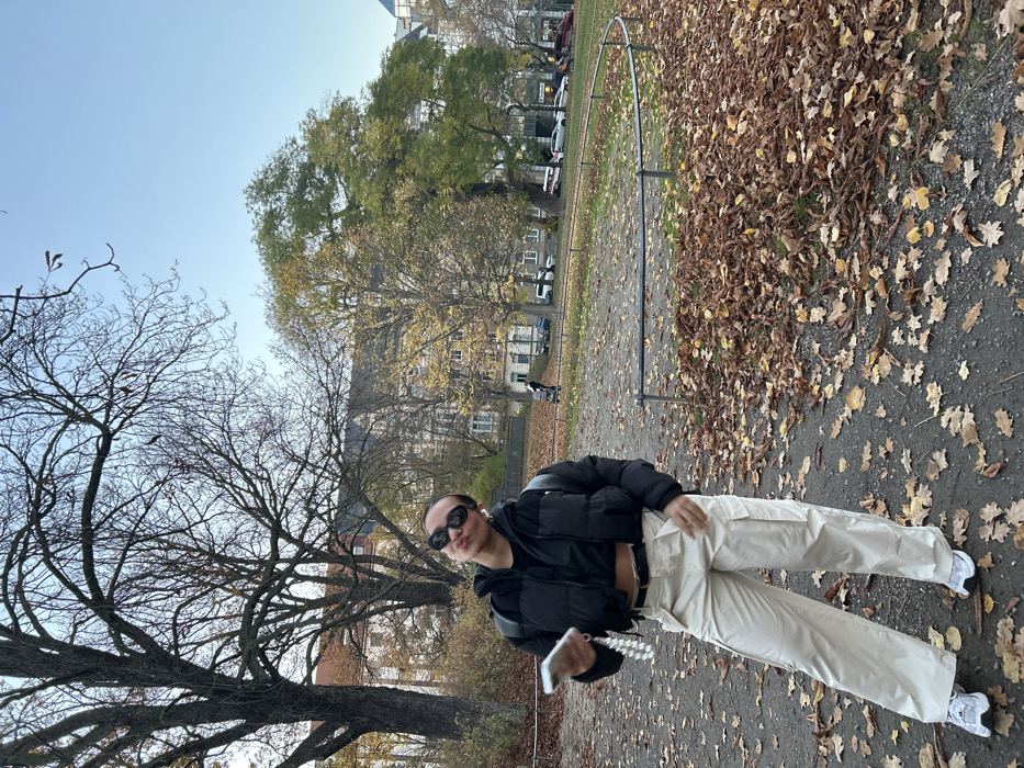 A female subject stands in a public green space within an urban area of Riesa, Germany. The location features residential buildings with varied architecture, including one with an orange-tiled roof, lining a street with parked vehicles visible in the background. The environment suggests autumn, with abundant brown and yellow fallen leaves covering the ground, which consists of a dark paved path, bare earth, and grass. The sky is clear and blue. The subject, positioned slightly left of center, is a female with dark hair pulled back, wearing dark sunglasses and white wireless earbuds. She is dressed in a black cropped puffer jacket over a black top, light beige cargo pants secured with a black belt, and white athletic shoes. She holds a white smartphone, fitted with a white beaded wrist strap, in her right hand. Her head is turned towards the camera, lips puckered in a discernible 'kissing face' pose. A low, curved metal barrier is visible in the mid-ground, separating the path area from a larger, leaf-covered section of the park. Deciduous trees with varying degrees of foliage loss are present throughout the scene. A distant figure is faintly visible on the street in the far background.