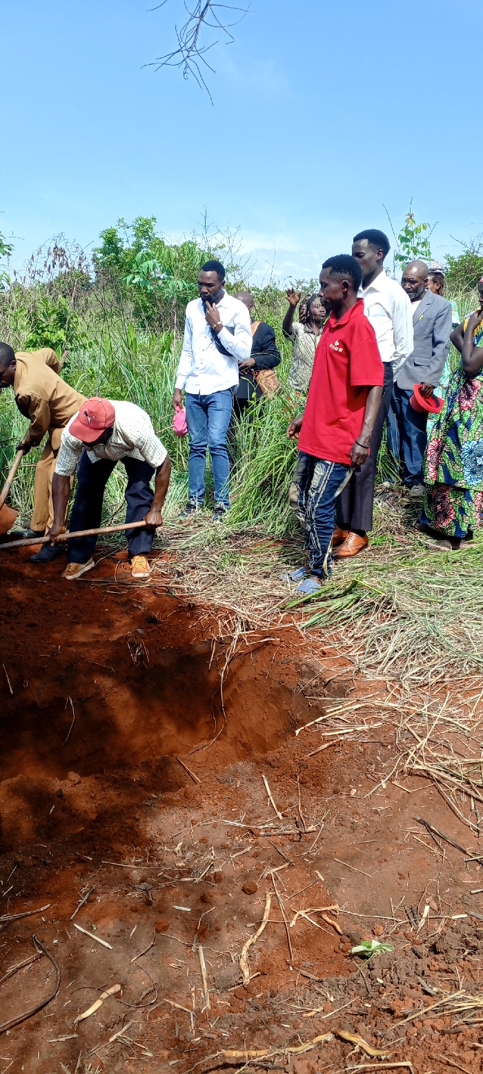 The image depicts an outdoor scene in Namisha, Democratic Republic of the Congo, under a clear blue sky. In the foreground, two men are actively digging a roughly rectangular pit in reddish-brown soil using long-handled spade-like tools. The man on the left wears a tan shirt and dark trousers, while the man deeper within the excavation wears a light-colored patterned shirt and a red baseball cap. Surrounding the pit, approximately ten to twelve individuals are gathered, observing the digging. In the mid-ground, a man in a white collared shirt, blue jeans, and a dark sling bag stands, his right hand touching his chin. To his right, a man in a red polo shirt and patterned trousers stands, facing left, also observing the activity. Further right and in the background, an older man with a grey beard, wearing a grey suit jacket, white shirt, and holding a red hat, is visible among other observers, including women in patterned dresses. The ground is reddish-brown earth interspersed with dry grass stalks and roots. The background features sparse green bushes and taller vegetation. A few bare tree branches are visible against the sky at the top of the frame.