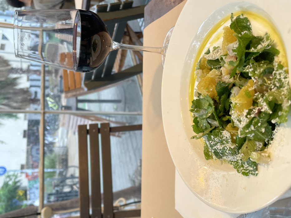 The image presents an eye-level view of a dining setting within a restaurant or cafe located in Tel-Aviv, Israel, looking out through a glass window. In the foreground, a white ceramic plate holds a salad consisting of green leafy vegetables, orange segments, and finely chopped white components, topped with grated white cheese and a drizzle of yellow dressing. Adjacent to the plate on the right, a stemmed wine glass containing red wine rests on a brown placemat. A light-colored table surface and a folded white napkin are also visible. Beyond the glass window, a blurred urban outdoor environment is depicted. Several empty wooden-slat chairs and tables, some with dark green frames, are arranged, indicating an outdoor dining area on a paved surface. Further in the background, palm trees are visible, along with a building wall featuring graffiti. A blue circular street sign with a white bicycle symbol is discernible in the upper left, and several bicycles are parked or positioned near the outdoor seating.