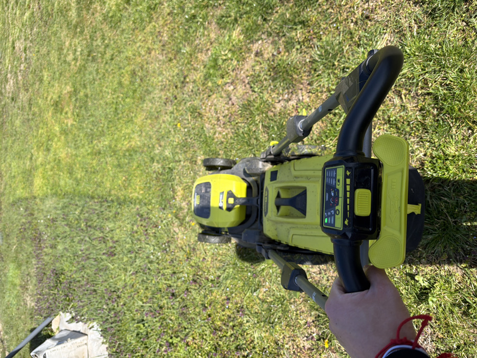 - "A first-person perspective photograph depicts a left hand, featuring a red wrist string, operating a yellow and black RYOBI electric lawnmower on a grassy area in Rupkite, Bulgaria" by FM-up5lz2, licensed under CC BY 4.0