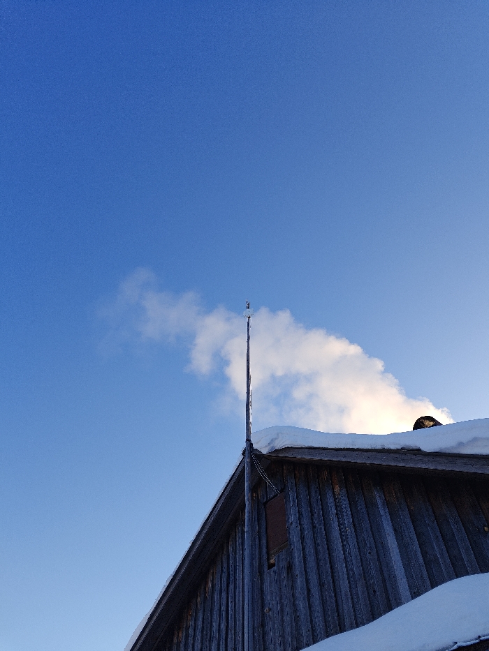 The image presents a forensic view of a building exterior in Nizhnyaya Gar', Russia. The scene is dominated by a clear, bright blue sky with sparse white clouds. In the lower right quadrant, a portion of a structure with weathered, vertically-aligned wooden plank siding is visible. The roof of this building is covered by a substantial layer of pristine white snow. From behind the snow-covered roofline, a dark, cylindrical object, consistent with a chimney, is partially observable, emitting a distinct plume of white smoke that drifts leftward across the frame. A tall, slender metallic pole, likely an antenna or lightning rod, is securely mounted to the corner of the building, extending vertically above the roof. The pole features small, intricate components at its uppermost point, and thin wires or cables are visibly secured along its length, running downwards. Below the antenna's mounting point on the wooden wall, a small, dark, rectangular panel is affixed. No individuals or specific interactions are present in the frame.