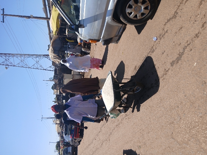 The scene depicts an outdoor commercial street in Jos, Nigeria, observed under a clear blue sky during daylight