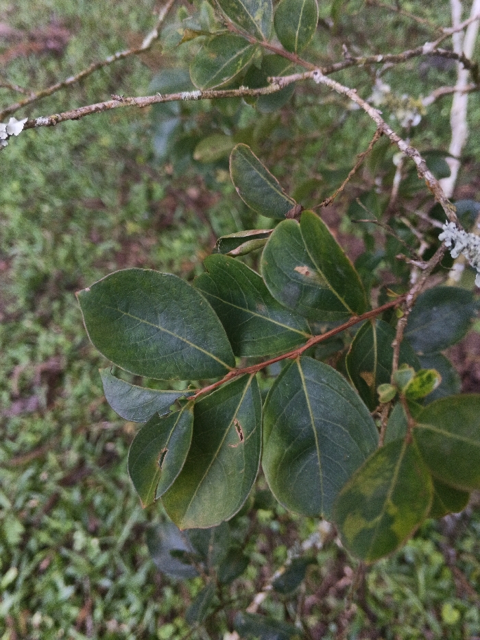 The image presents a close-up, top-down view of a leafy plant branch, situated in Stueng Saen, Cambodia. The primary subject is a cluster of dark green, ovate leaves attached to reddish-brown stems. Several leaves exhibit minor imperfections, including small tears or light brown discolorations. A prominent reddish-brown stem runs horizontally through the frame, with smaller branches extending from it. In the blurred background and upper portions of the image, thinner, older branches are visible, covered with patches of light grey lichen. The overall background consists of out-of-focus green foliage or grass, indicating an outdoor natural environment. No individuals, animals, or artificial objects are present. No specific actions or interactions are depicted.