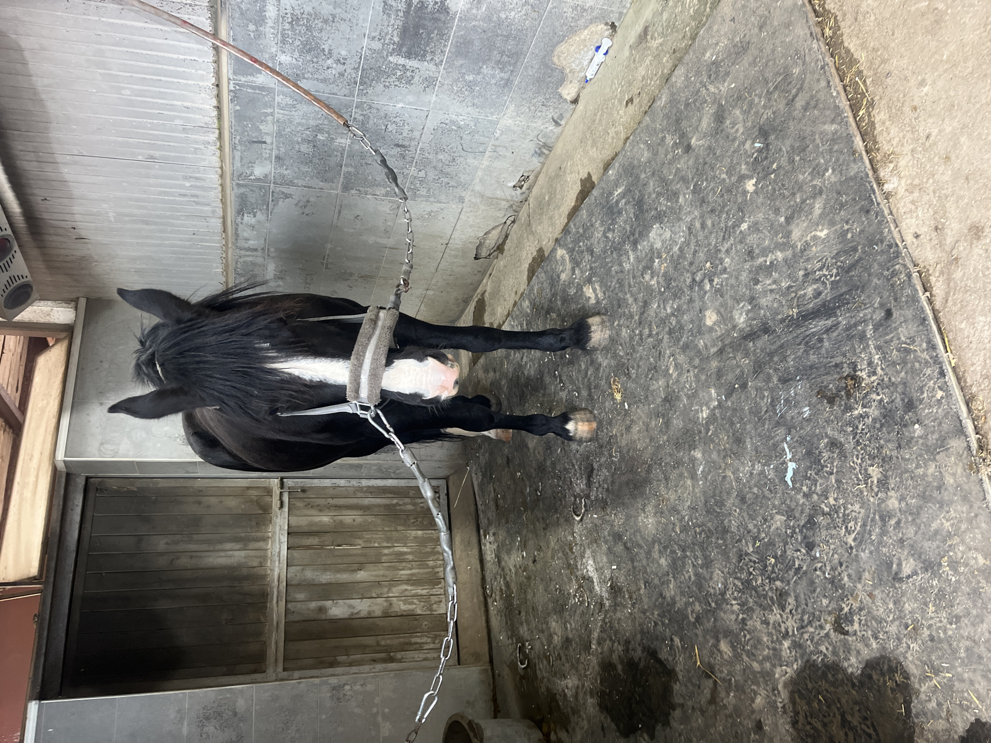 - "A black and white horse stands in a stall with a concrete floor" by FM-qlshF3, licensed under CC BY 4.0