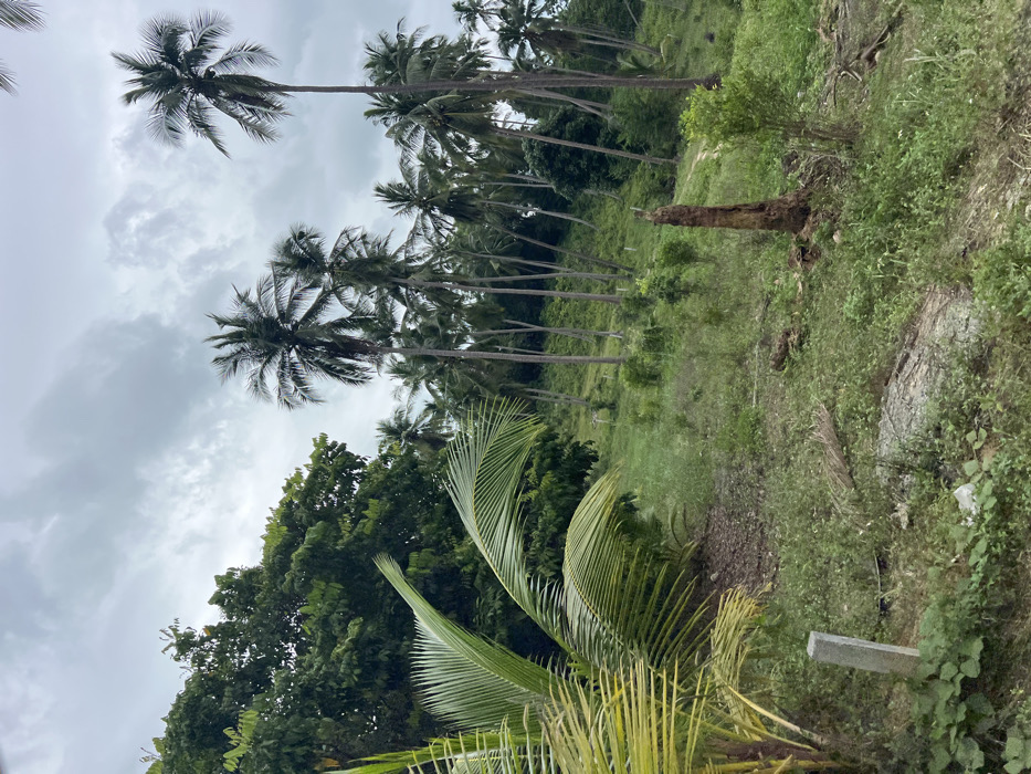 A landscape featuring numerous tall palm trees against a cloudy sky. The trees are scattered across a grassy terrain, interspersed with other greenery and some felled tree trunks. A large, vibrant palm leaf occupies the foreground, partially obscuring a dense patch of trees. A concrete post is visible near the leaf, adding a human-made element to the otherwise natural setting.