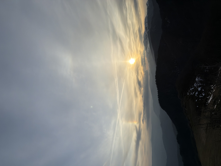 The image depicts a panoramic mountainous landscape at sunrise or sunset, observed from or near the city of Hristo Danovo, Bulgaria. The upper two-thirds of the frame are occupied by a sky transitioning from light grey-blue overhead to yellow and orange tones near the horizon. A bright, low-lying sun is visible on the right, emitting a distinct vertical sun pillar and illuminating a prominent parhelion to its left. A fainter, smaller arc of light is present further left in the sky. Two white contrails intersect in the mid-sky, forming an "X" pattern. The foreground features a dark, undulating ridge partially covered with patches of snow and sparse brown vegetation. Multiple layers of mountains recede into the distance, appearing progressively darker and bluer due to atmospheric haze. The furthest mountain peaks in the background are snow-capped and illuminated by the low sunlight. No individuals or man-made structures are discernible within the scene.
