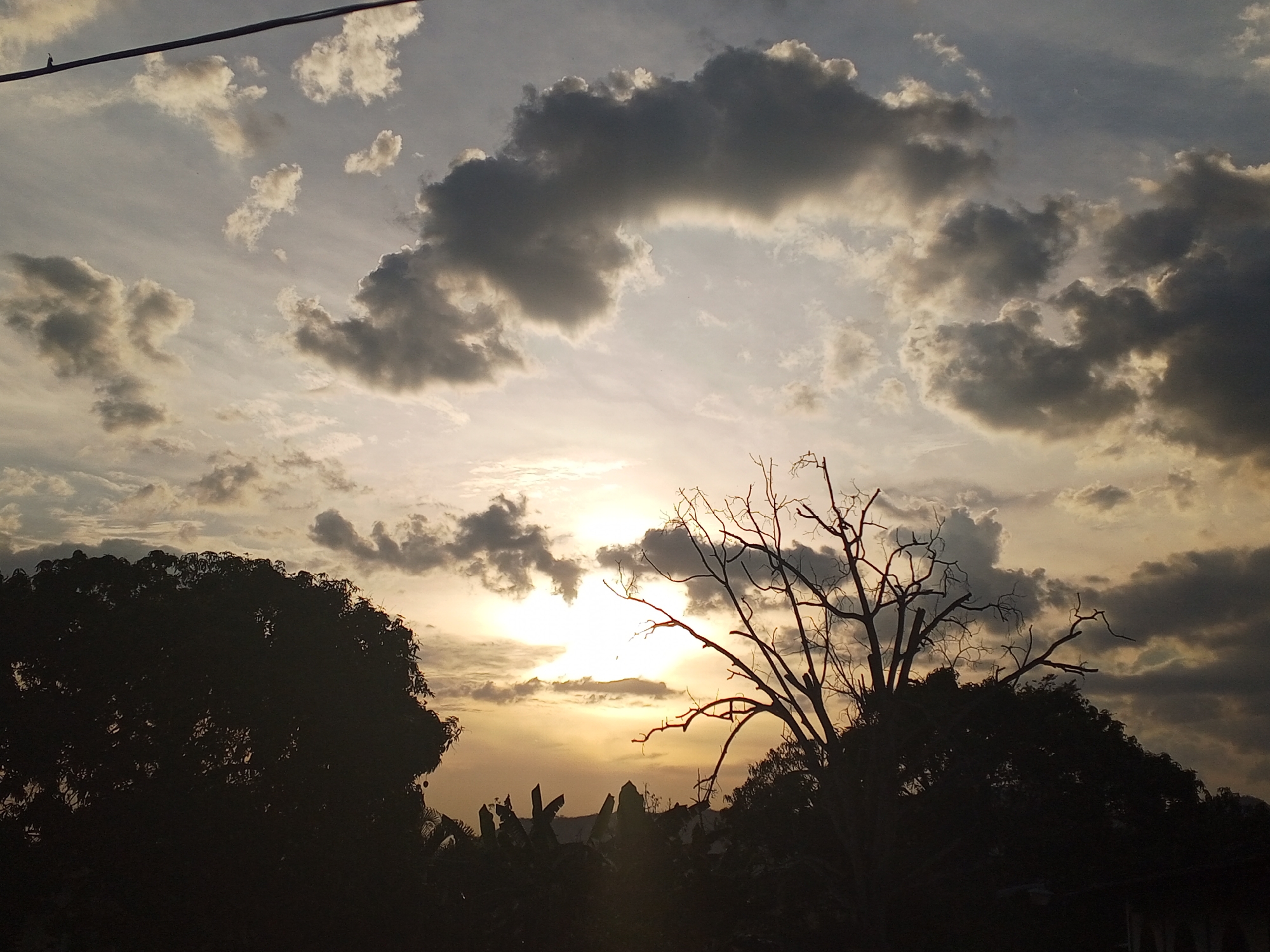The image depicts a sunset sky above the city of Los Leoncitos, Venezuela. Heavy cloud cover obscures much of the sky, with a visible break near the horizon where the sun is setting. Silhouetted trees fill the lower portion of the frame, one of which is bare of leaves. A power line runs across the top left of the image.