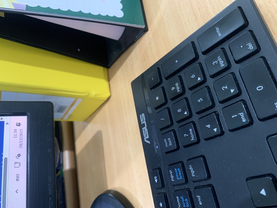 black ASUS numeric keypad with a standard layout, including keys for numbers 0-9, arithmetic operators, and navigation functions like "home," "end," "pgup," and "pgdn." A screen displays "11.59" and the date "29/12/2025" along with "IND" and "TO/ INPUT/EXIT." Part of a yellow and green file folder is also visible. The entire scene is captured on a wooden surface.