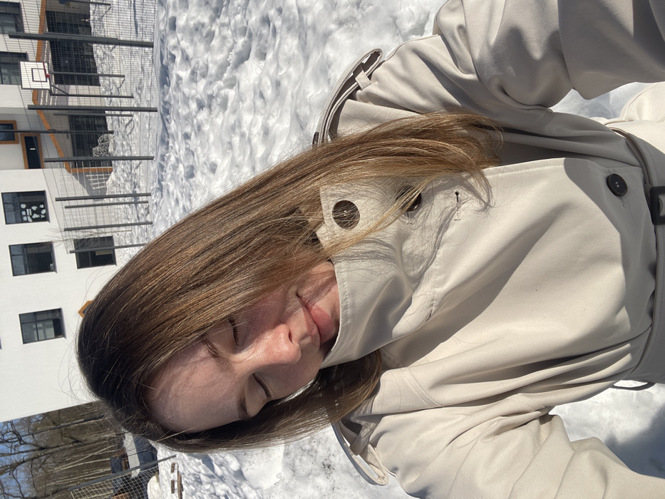 The image depicts a female individual outdoors in a snow-covered environment, identified as the area adjacent to School No. 2070 in Kommunarka, Russia. The subject occupies the foreground, facing slightly downwards with closed eyes and a subtle smile. Her long, light brown hair is parted on the left and falls over her right shoulder and the collar of her light-colored, belted trench coat. Dark buttons are visible on the coat's standing collar and front closure. The background consists of extensive, uneven snow-covered ground. Behind the snow, a metal fence with vertical bars separates the foreground from a modern, multi-story white building featuring multiple dark-framed rectangular windows. One upper-story window on the building's left side contains a white decorative shape. To the right of the building and behind the fence, a basketball court is visible, marked by a white backboard and a red rim. In the far left background, bare deciduous trees rise against a clear blue sky. The scene is brightly illuminated by direct sunlight, casting distinct shadows and indicating a sunny day during a cold season.