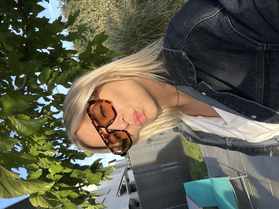 A blonde female is depicted in a close-up outdoor shot in Chambœuf, France, posing with pursed lips towards the camera. She wears amber-tinted, tortoiseshell-patterned hexagonal sunglasses with a double bridge, a white V-neck shirt, and a dark blue denim jacket. A thin black beaded choker is visible around her neck. Her hair is straight and shoulder-length. Above her head, sunlit green leaves from a tree are visible. The background on the left features modern light-colored residential buildings with dark roofs and a gray metal fence, along with a partial view of a light blue metal outdoor chair and table on a paved surface. On the right, dense green foliage forms the background. The scene is illuminated by strong natural sunlight from the upper right, creating distinct highlights and shadows.