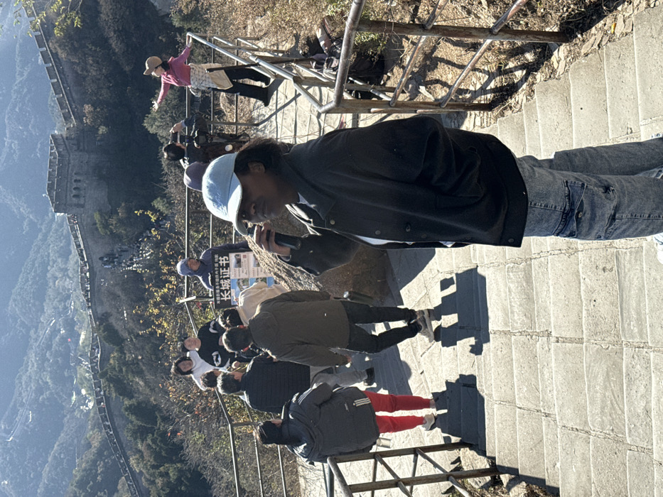 The image captures an outdoor scene at the Badaling section of the Great Wall of China, located in Yanqing District, China. The environment is a mountainous, forested landscape under bright sunlight. In the foreground, a person of African descent stands on a wide stone staircase, partially facing the camera and looking towards the right side of the frame. This individual wears a light blue baseball cap, a dark-colored collared jacket over a white shirt, and light blue distressed cargo jeans. They are holding a black cylindrical object near their jawline. Prominent shadows from this person and others are cast onto the stone steps to their left. Behind the foreground subject and further up the stairs, numerous other individuals are visible, predominantly of East Asian appearance. These people are scattered across stone steps, elevated platforms, and along the distant sections of the Great Wall. On the far right midground, a woman in a pink top and light-colored pants stands on a platform with her arms outstretched, posing for a photograph. Another person is visible holding a camera-like device, presumably photographing her. To the left of the stairs, a group of three women are smiling towards the right. A dark-colored vertical sign with Chinese characters, including "长城证书" (Great Wall Certificate), is positioned in the midground near a large rock formation and metal railings. The Great Wall, a prominent stone structure with multiple watchtowers, snakes across the distant mountainous terrain, with many small figures of people visible traversing its length. Dark metal railings line the sides of the stone staircase and platforms in the midground.