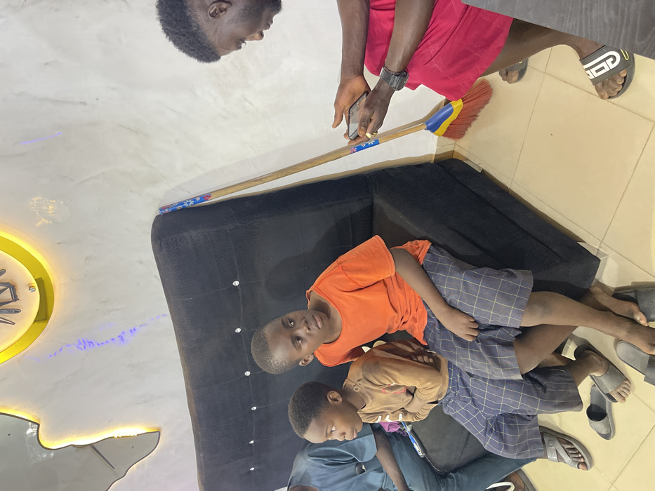 Two young boys are lying on a black couch, wearing casual clothes. A man stands behind the couch, holding a phone and a broom. One boy wears an orange shirt and checkered shorts, while the other wears a brown shirt and similar shorts. The man is dressed in a red top and dark shorts. Sandals are scattered around the floor. A decorative wall fixture with a yellow circular component is visible in the background. The scene appears informal and candid.