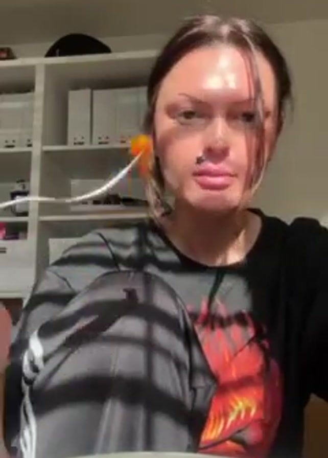 A woman is sitting down while eating off of a plate in her lap. She is wearing a black T-shirt with an orange, flaming design. She has dark hair that is tied back. She has a black star drawn on her cheek. She is eating with a fork. On the plate are what appear to be sausage and some vegetables. Behind her is a white bookshelf. Light from a window is shining on her face.