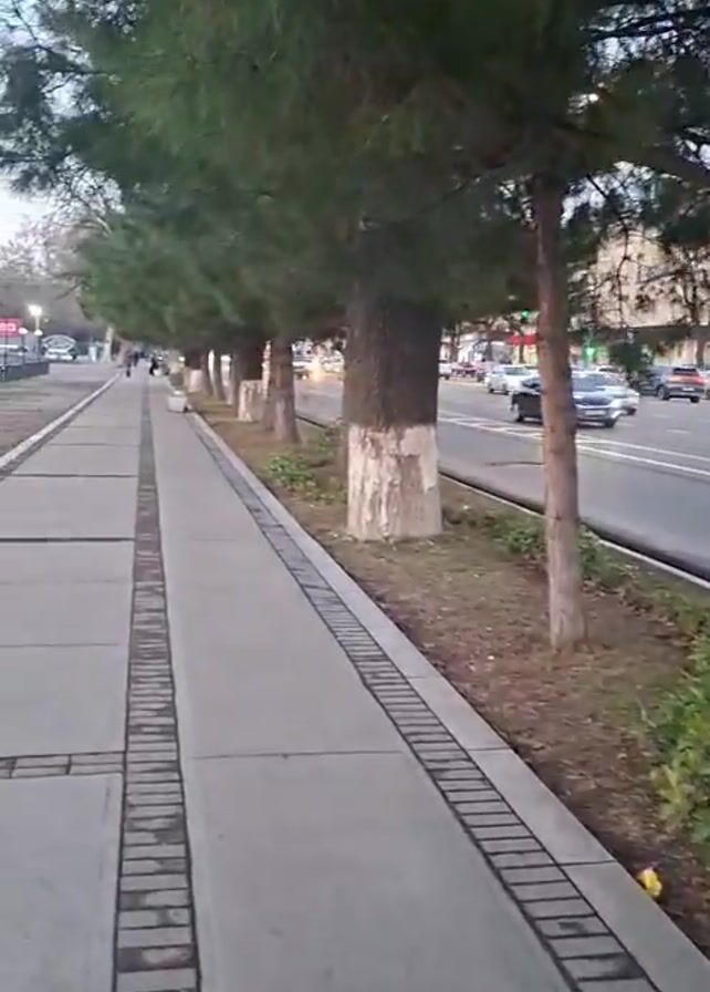 sidewalk beside a road. The sidewalk is made of concrete and has a brick border. There are tall green trees lining the sidewalk, and the lower portions of their trunks are painted white. The road has cars driving on it. In the distance, a tall tower can be seen. The sky is overcast. There are a few people walking on the sidewalk in the distance.