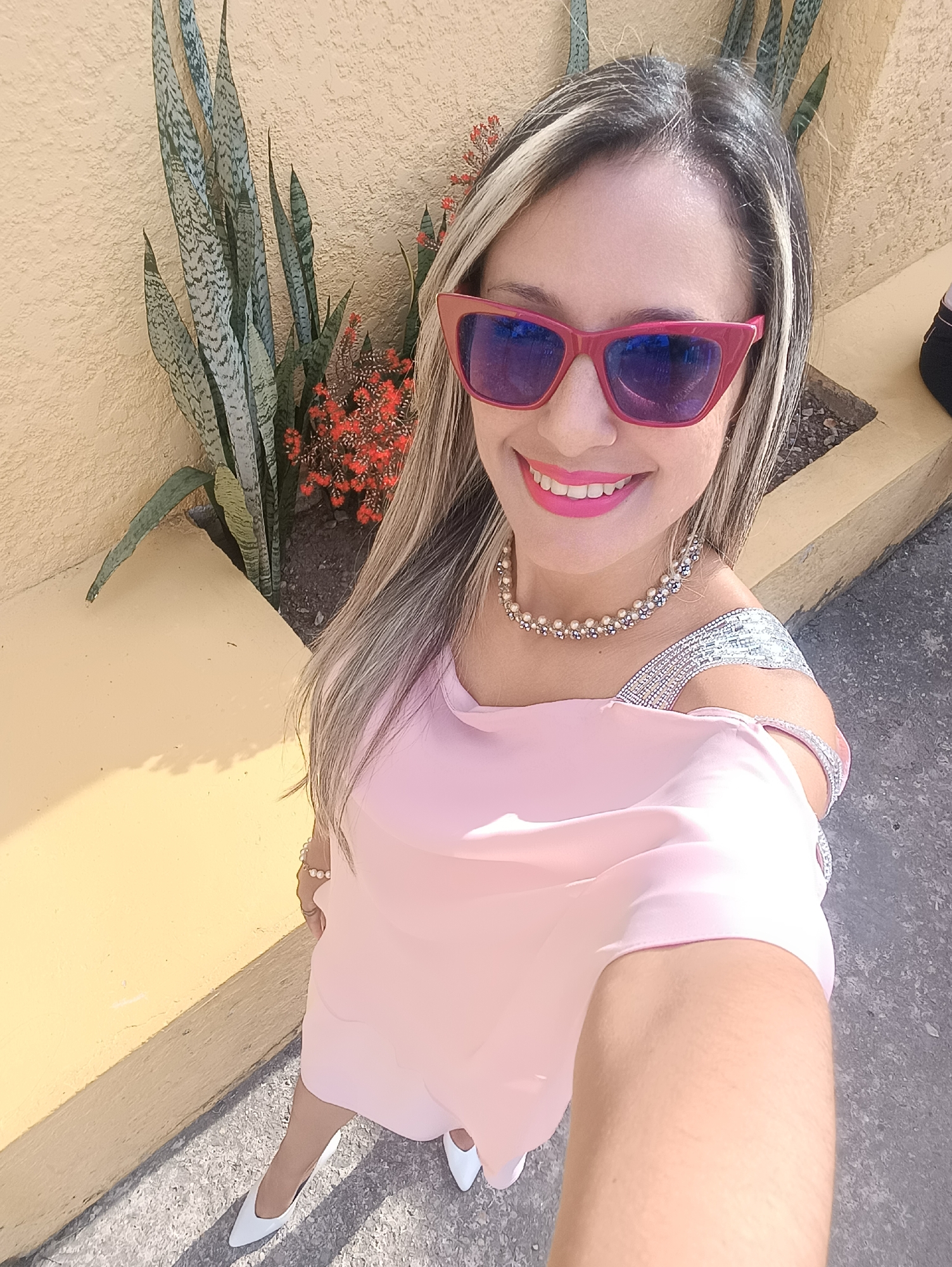 A female subject is captured in a selfie taken outdoors in Las Tejerías, Venezuela. She is smiling and looking directly at the camera, wearing red cat-eye sunglasses with blue reflective lenses and bright pink lipstick. Her long, straight hair features blonde highlights and visible darker roots. She wears a light pink, off-the-shoulder top or dress with a draped neckline, a silver sequined shoulder strap, and a pearl and silver-toned beaded necklace. White pointed-toe heels are visible on her feet. The background shows a textured, light yellow wall. Along the base of the wall is a planter containing tall, variegated green Sansevieria plants and a cluster of small, bright red-orange flowers. The ground is light gray, textured pavement. The scene is brightly illuminated by direct sunlight, casting distinct shadows on the wall.