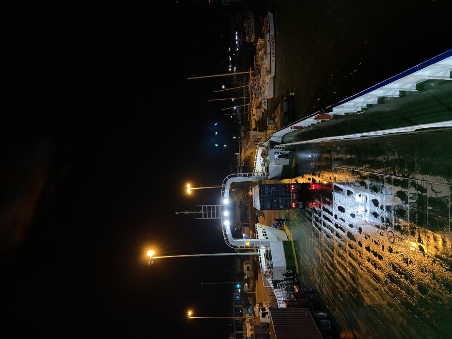 A nighttime view from a vessel, possibly a ferry, shows a truck with a shipping container being loaded