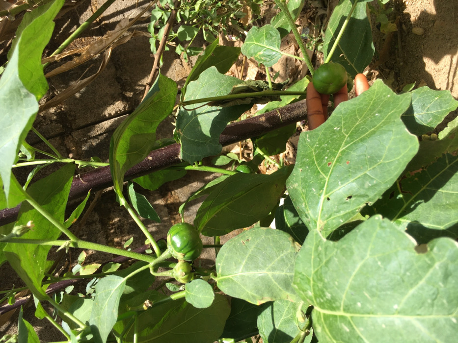 The image displays a close-up of a garden egg plant (Solanum aethiopicum) situated outdoors in Jos, Nigeria