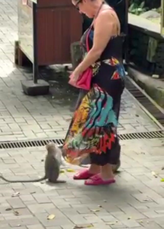 A woman in a colorful dress and pink sandals stands on a paved pathway with two monkeys. One monkey tugs at her dress while another sits nearby. The woman looks down at the monkeys and adjusts her dress. A man in a dark shirt stands in the background, near a brown booth with signage. The pathway is made of gray bricks and has a metal grate along the edge. There are leaves scattered on the ground. The scene appears to be outdoors.