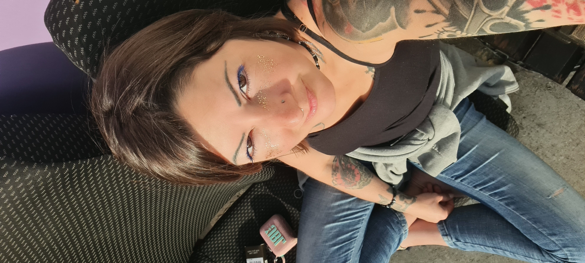 An individual, appearing female, is depicted in a close-up, high-angle shot, seated outdoors in Rishon LeZion, Israel, under direct sunlight. The individual wears a black sleeveless top, blue jeans with a tear on the right knee, and a grey hooded sweatshirt tied around the waist. Distinguishing features include short-to-medium length brown hair, blue eyeliner, gold glitter on the upper cheeks below the eyes, a silver stud piercing on the left nostril, a silver septum ring, and a dark choker necklace with silver chain accents. Extensive tattoos are visible on both forearms and biceps. The individual is looking directly at the camera with a neutral expression. To the left, a pink JBL Go 3 portable speaker with green "JBL" lettering is visible, along with a small black rectangular object. The immediate background behind the individual consists of a dark, textured fabric with a light geometric pattern, possibly upholstery. The surface beneath the individual appears to be paved concrete or asphalt.