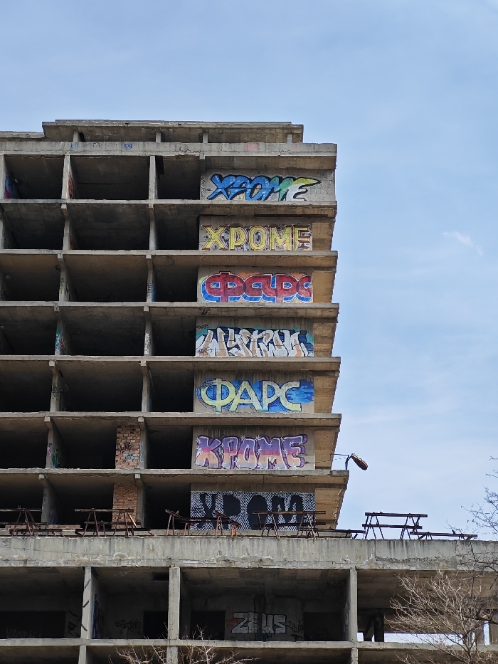 The image depicts a multi-story, unfinished concrete building skeleton located in Sofia, Bulgaria