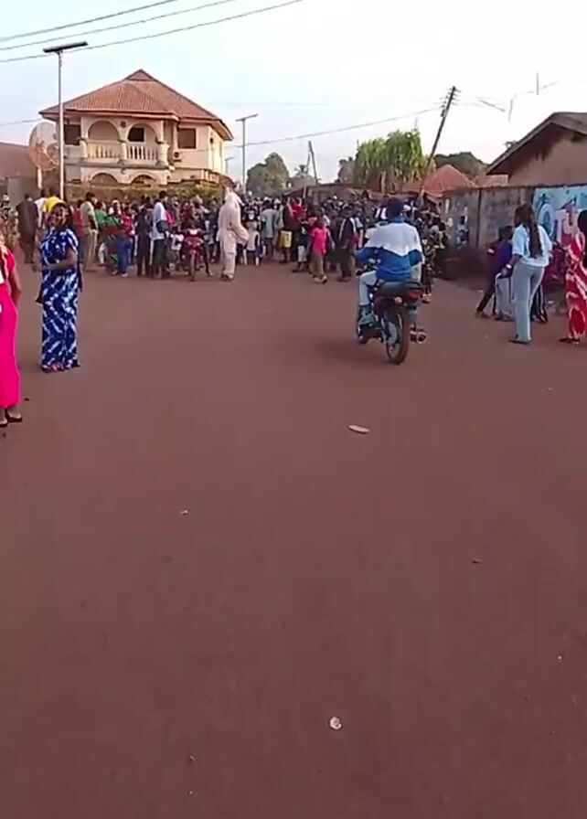 street in what appears to be a small town or village. The street is packed with people standing and watching as two motorcycles drive through the crowd. There is a large building with a balcony visible in the background, as well as other smaller structures. The road is a red-brown color, and the sky is overcast. The people are dressed in a variety of clothing. The motorcycles are driven slowly through the crowd of people.