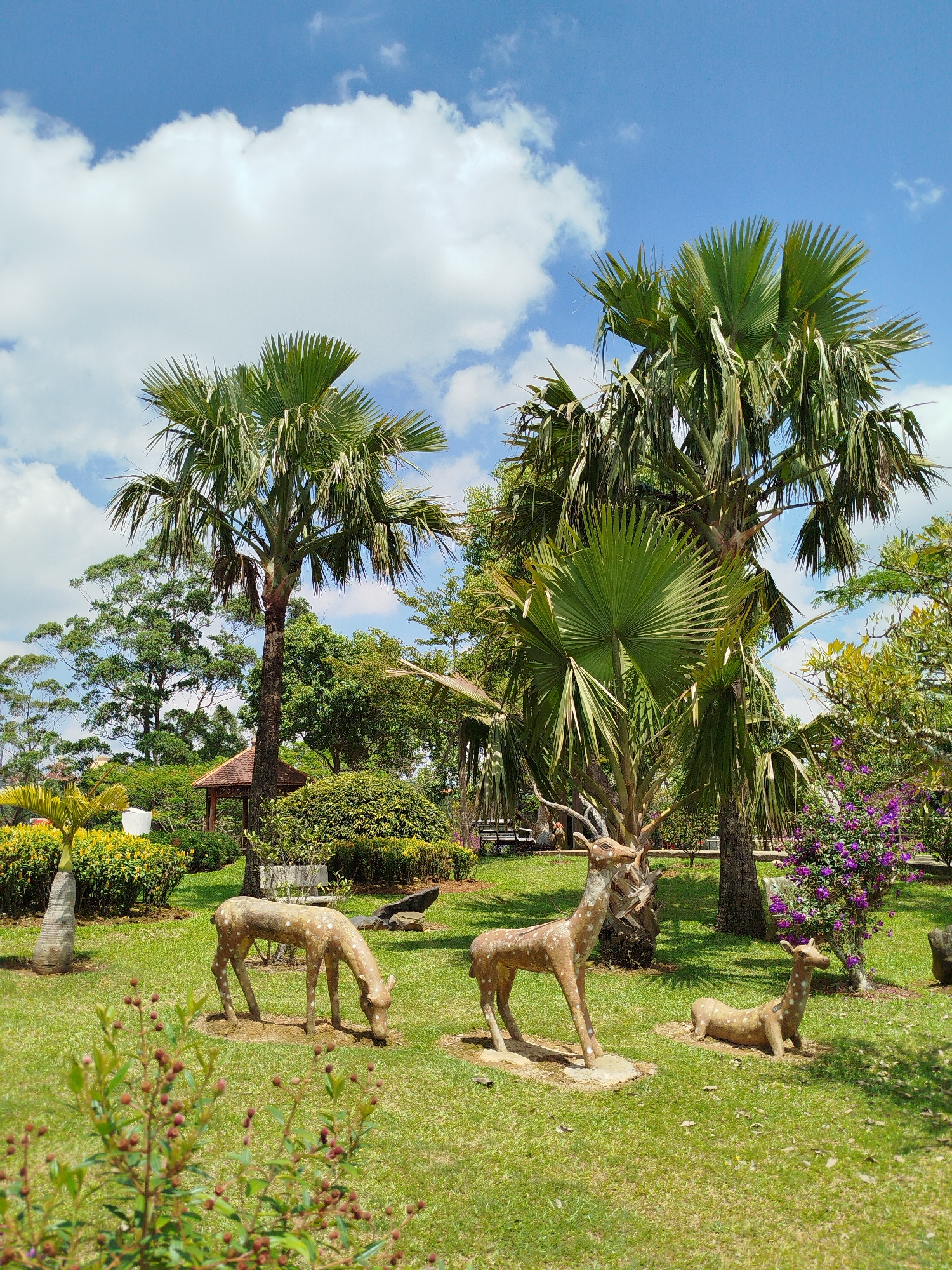 park scene in Lam Vien - Da Lat, Vietnam. In the foreground, there are three deer statues arranged on a green lawn. Two palm trees stand prominently in the midground, with other trees and shrubs completing the greenery. A small wooden gazebo is visible in the background. The sky is blue with scattered white clouds.
