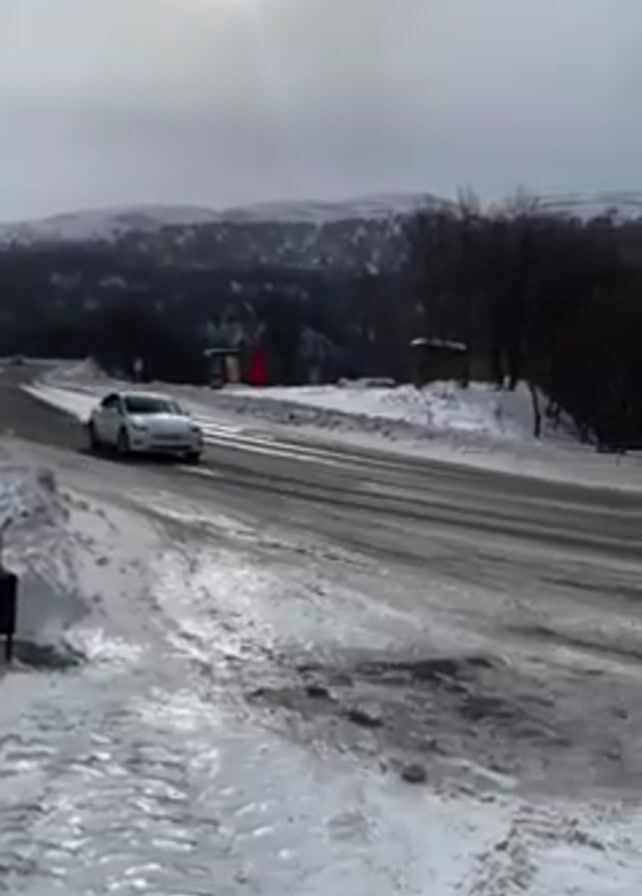 white car driving along a snowy road on a cloudy day. The road winds through a mountainous area with trees on either side. Snow covers the ground and is piled up on the sides of the road. As the white car continues, it passes a black car on the side of the road. Two dogs lay on the snowy ground next to the black car.