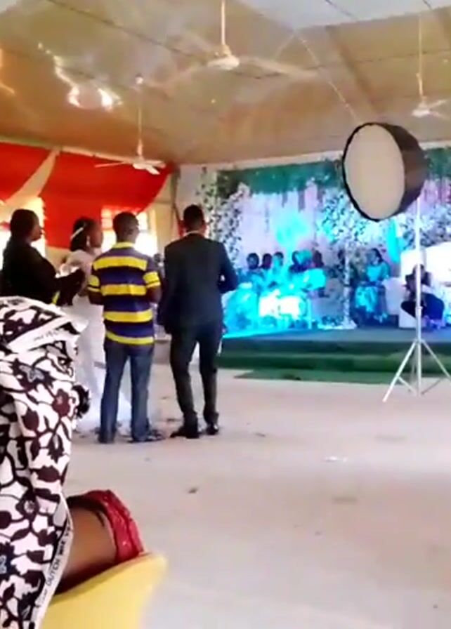 n indoor event that appears to be a ceremony or celebration. The room is decorated with red, white, and green drapes, which are likely for a holiday. Attendees are seated at tables, and there is a stage area with decorations, including what looks like artificial greenery and white floral arrangements. Several people are visible on or near the stage. A large light source is set up on a tripod near the stage. From the perspective of the videographer, the focus is mainly on the back of the heads of people in the foreground, with the larger event unfolding in the distance.