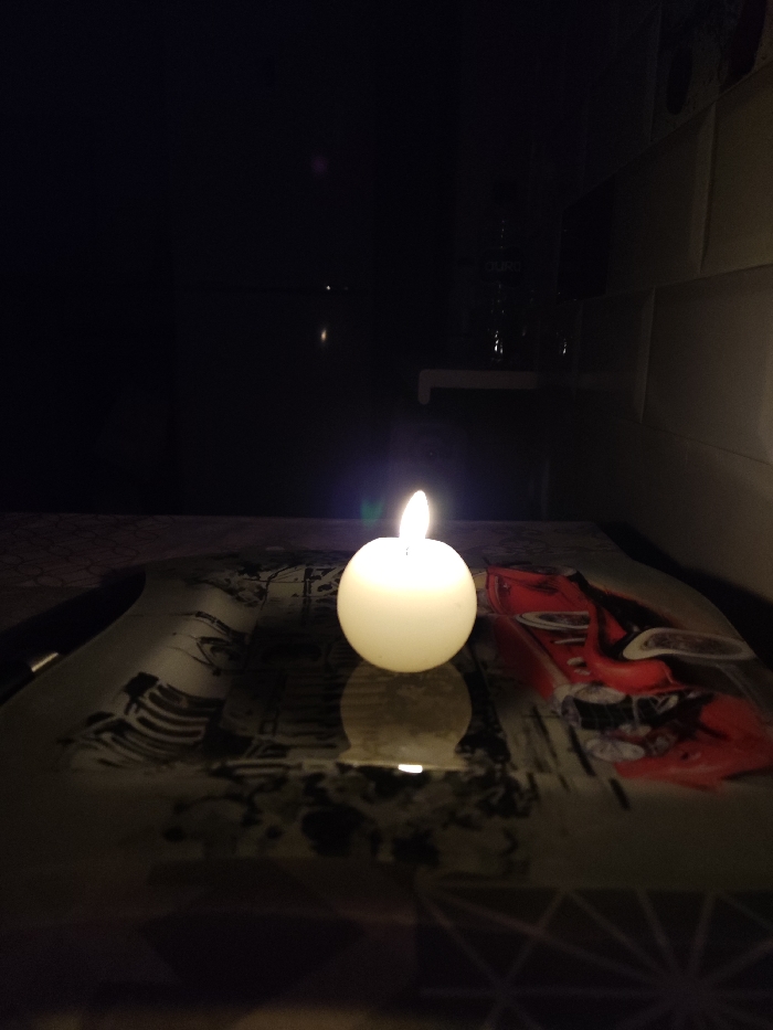 - "A single, lit, spherical white candle is centrally positioned on a dark, reflective surface in an indoor setting" by FM-7sMlE3, licensed under CC BY 4.0