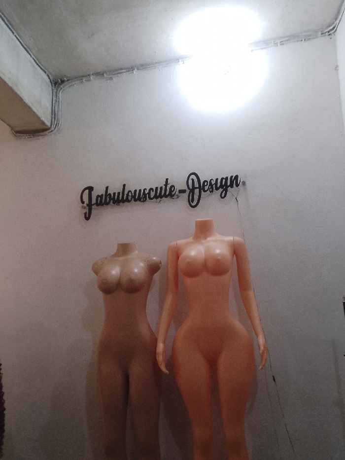 An indoor scene in Onitsha, Nigeria, displays two headless female mannequins against a light-colored, textured wall