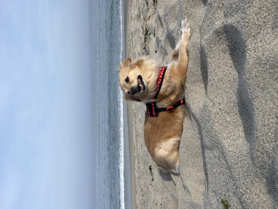 - "A medium-sized dog, exhibiting light brown and golden fur with a shaggy texture around its neck, is lying on a sandy beach" by FM-m1kZq2, licensed under CC BY 4.0