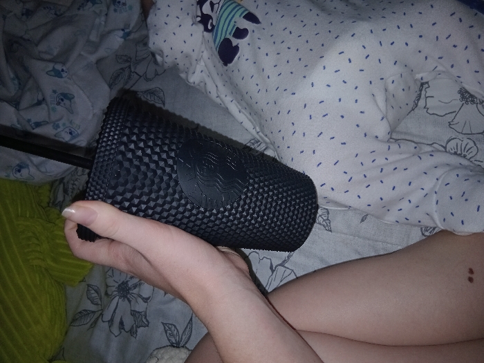 The image depicts an indoor, domestic scene, location Unknown, Unknown. An adult's light-skinned left forearm and hand are centrally positioned, holding a black, studded Starbucks tumbler with a black straw. The Starbucks logo is embossed on the tumbler's side. The adult's exposed upper left thigh, displaying two small, dark moles, is visible in the lower left quadrant. To the right of the adult's arm, an infant lies on its back, partially visible, wearing a white, long-sleeved onesie patterned with small blue dashes and a graphic of an animal wearing a striped shirt on the chest. The subjects are situated on bedding, which includes a light grey fitted sheet or blanket with a white floral pattern and a white blanket featuring a pattern of blue cartoon dog faces. A textured, bright chartreuse green fabric object is partially visible in the upper left background.