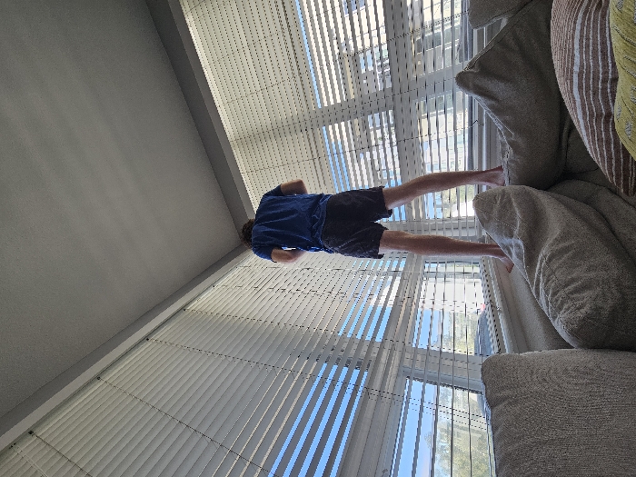 The image displays the interior of a room, likely an apartment or condominium, with a clear view of an exterior environment consistent with Los Angeles, United States of America. A fair-skinned male, seen from the back, stands barefoot on the light-colored fabric cushions of a large couch. He wears a blue short-sleeved t-shirt and dark shorts. His hair appears dark and somewhat disheveled. His posture suggests he is observing something outside, as he faces a wide expanse of windows fitted with white horizontal blinds. The blinds are partially open, allowing natural light to enter and offering glimpses of the outdoors. The room's ceiling is plain and light grey. In the foreground, the beige or light grey fabric couch features prominent back cushions and armrests. Decorative pillows with distinct patterns, including brown and white stripes and a yellow-green texture, are visible on the couch. Through the windows and blinds, a clear blue sky is discernible. Beyond the windows, green foliage, presumably from trees, and portions of other light-colored buildings are visible, indicating an urban or residential setting.